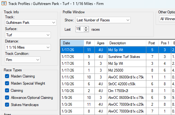 ValueCapper also includes a new addition to the Track Profiles: instead of specifying a date range, you now have the option to specify a number of races. Traditionally, the Track Profiles feature expects you to enter a Start Date and End Date; race results are then loaded based on this date range. If there have not been many races recently run, then the Track Profile will be sparse. Now, you can specify a fixed number of race -- for example, 10 -- and Track Profiles will list 10 races, regardless of when those races were run: