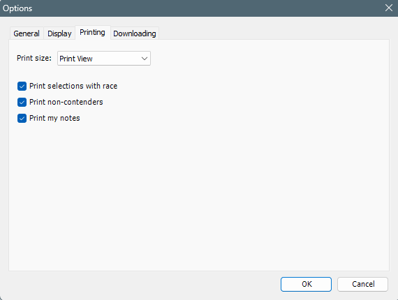 - Print my notes: if checked, any race notes you make will be included in the printout after each race.