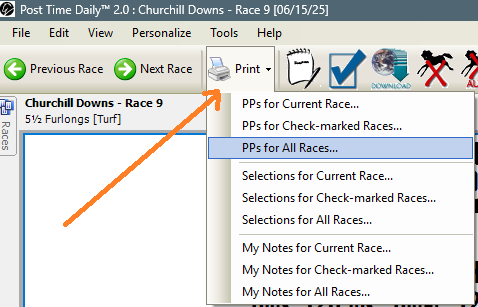 - PPs for Current Race: Prints the past performances for the currently selected race.