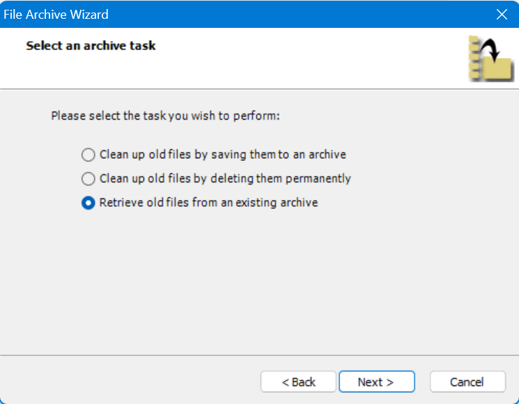 Once open the File Archive Wizard will present you with three task options:
