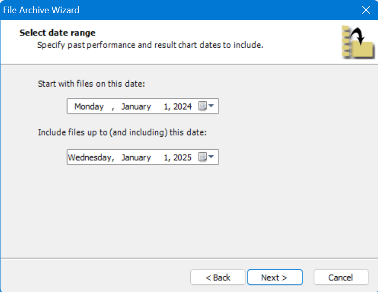 Select a date range. All files within this date range will be moved from the current PC into a ZIP archive. Click Next to proceed.