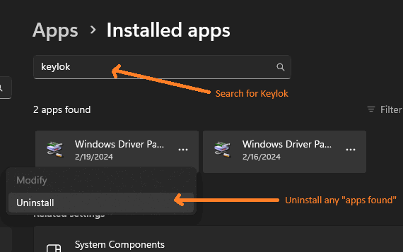 - In Windows, run Add or Remove Programs and locate any apps related to “Keylok” (see picture below):