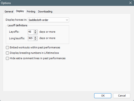 - Layoffs: define the number of days constituting a layoff. In the past performances, a layoff line will be drawn if a past performance line was run this many days (or more) after the previous race.
