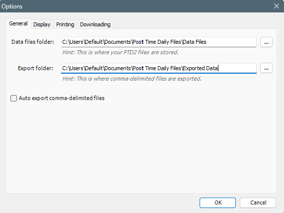 - Auto export comma-delimited files: if checked, the program will automatically export a .PTD2 file to CSV. If not checked, you will need to manually export any files through the File menu.