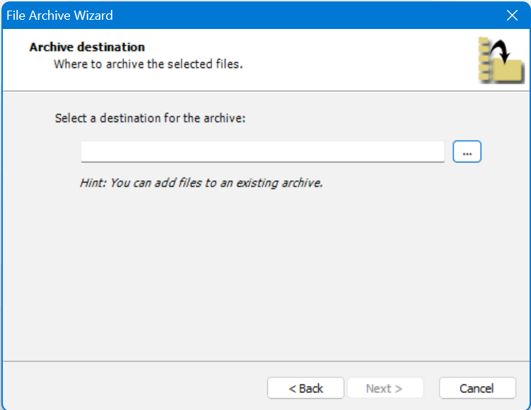 Once open the File Archive Wizard will present you with three task options: