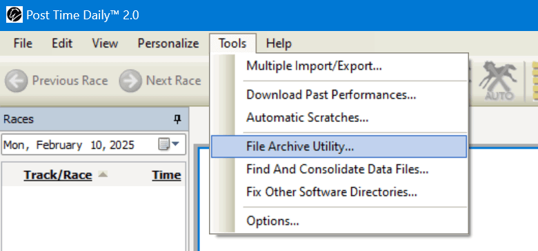 If you’re using Post Time Daily, the File Archive Wizard (or also called the File Archive Utility) can be found under the “Tools” menu: